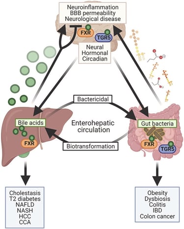 Ferrell JM, Chiang JYL. Bile acid receptors and signaling crosstalk in the liver, gut and brain. Liver Res. 2021 Jul 18;5(3):105-118. doi: 10.1016/j.livres.2021.07.002. PMID: 39957847; PMCID: PMC11791822.